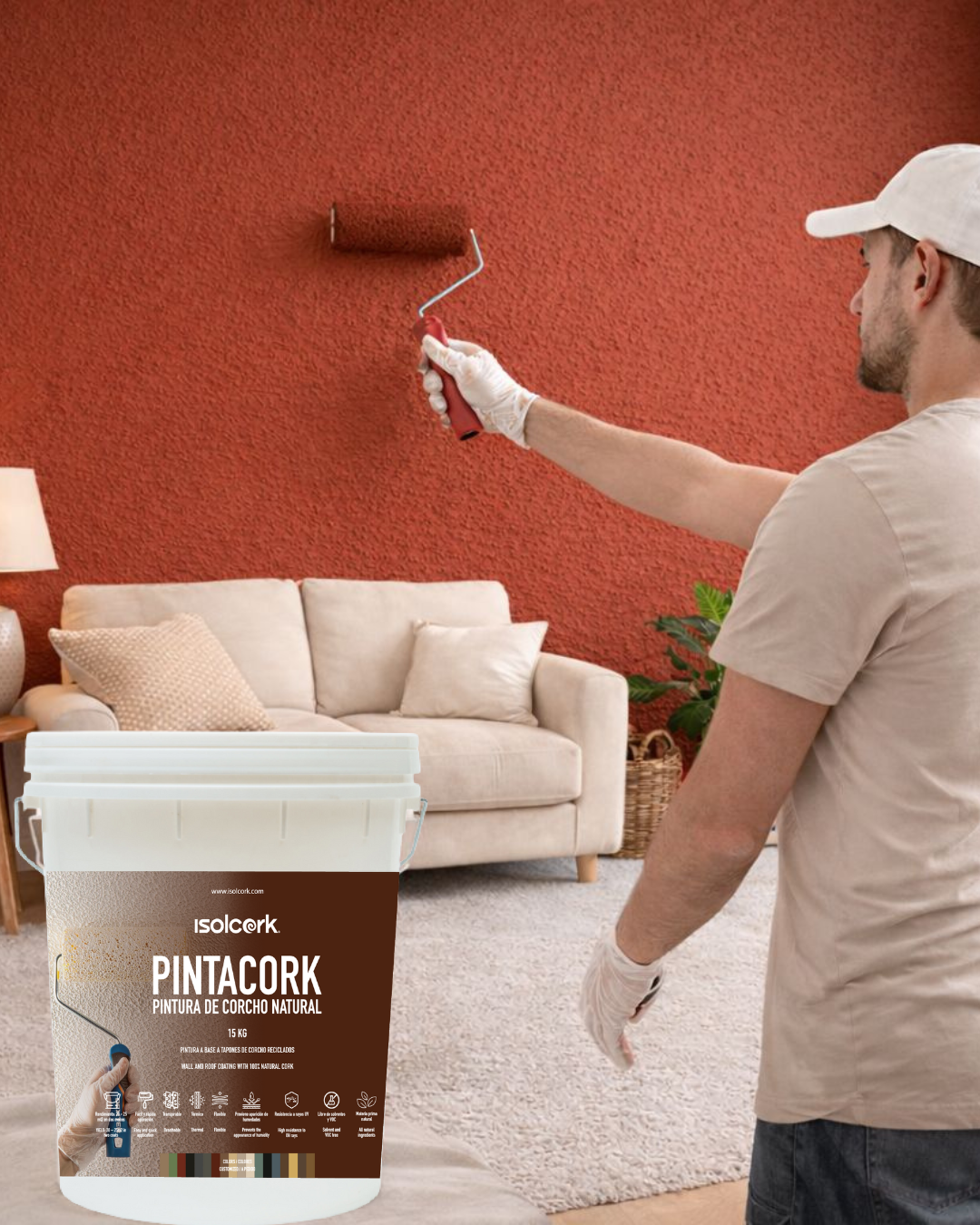 - Características: Pintura con terminación coloreada, a base de polvo de corcho